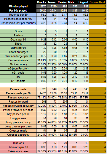 Furthermore, Brooks is still a young player at twenty-three, with his biggest opposition for game-time being Daniel James a year younger. Brooks here has a better output than Lingard, and although Mata’s passing stats are better, his age is getting to him and he will be moved on soon. Brooks would probably be a good addition if Ole Gunnar Solskjaer wanted him in the side, offering a different but equally quality option to Daniel James, with the two Welshmen potentially being in the side for years to come.